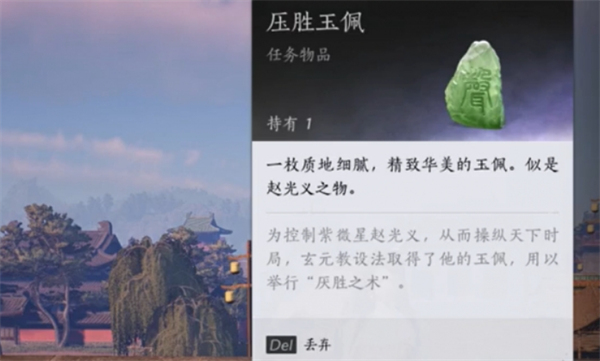1、完成“白日参辰”任务(需击败3波夜枭刺客并保护证人至安全屋)后,自动获得“压胜玉佩”(绑定道具,不可交易)。