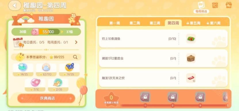 心动小镇稚趣园第四周任务涵盖日常任务与收集挑战任务,完成后可获限定活动奖励及家具碎片,日常任务有钓湖鱼、捕捉两星昆虫、触发无米之炊、拍摄两星鸟卡、除草、在猫女士商店购物、使用表情、完成集体事件目标、采集黑色矿石、制作物品等;收集挑战需参与收集并达成不同进度,玩家完成7个任务即可拿满周奖励,可按自身情况灵活选择任务完成顺序。