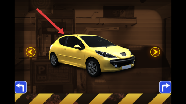 2、进入选车界面,箭头指向黄色轿车,点击该车辆模型,确认选择此车,随后将进入具体的停车关卡场景。
