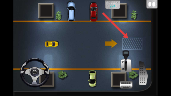 3、在停车关卡,依据画面箭头指引,通过方向盘、挡位及踏板操控黄色车辆,将车精准驶入右侧斜线标识的停车位。