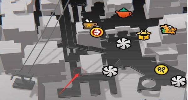 3、聚焦地图下方区域,按红箭头指向的路径探索,突破场景遮挡,解锁小卡格车所在位置。