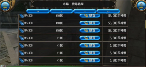 2、在市场,通过【搜寻】找“MP+300”等道具,对比不同数量(10颗、1颗)的价格,选性价比高的购买补充资源。