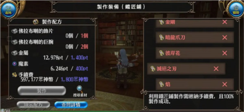 1、制作装备时,进入【锻匠铺】,凑齐所需材料(如佛拉布喇的剑片等),点击【制作】,利用100%成功机制打造装备。