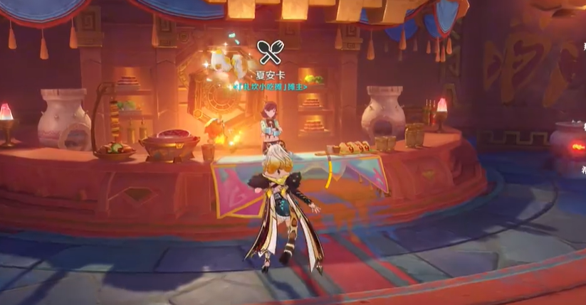 2、到达扎坎小吃摊处后,与NPC夏安卡进行对话,在对话选项中选择购买食谱的相关选项,进入食谱购买界面。