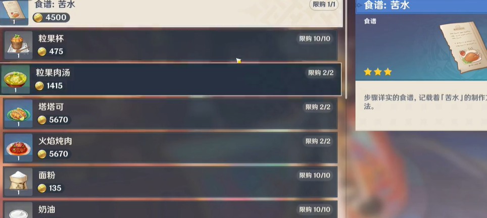 3、最后在食谱购买页面中,找到苦水食谱,确认后消耗4500个摩拉币,即可成功获取该食谱。
