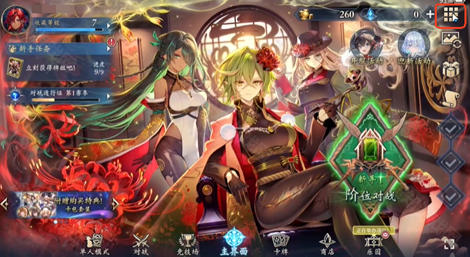 1、首先启动游戏,待加载完成进入主界面,点击右上角呈九宫格样式的图标,随即展开菜单选项。