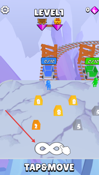 1、点“∞”图标(TAP&MOVE),收集黄色矿石(数字8),给蓝色矿车攒能量。