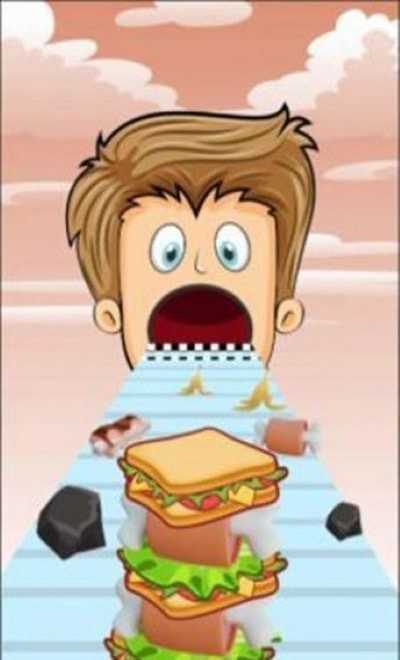 1、操控三明治沿跑道前行,避开两侧紫色障碍,维持堆叠完整。