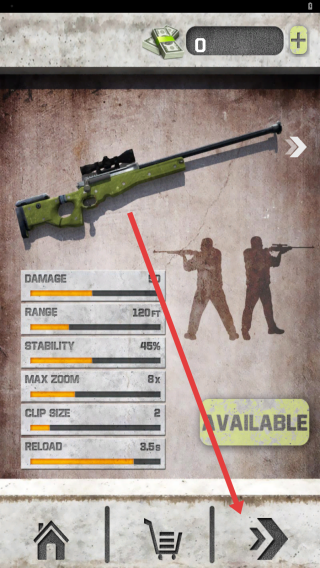 2、在武器页,确认绿色狙击枪属性(伤害、射程等),点击箭头指向按钮,进入任务选择。