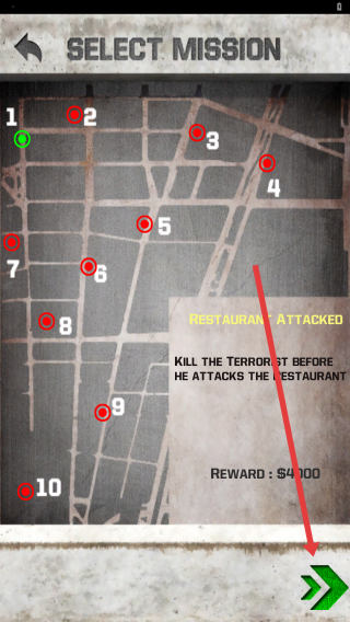 3、选“RESTAURANT-ATTACKED”任务(奖励$4100),点击绿色箭头,开始狙击恐怖分子,保护餐厅。