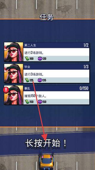 1、任务界面,显示“第二人生(进行2场游戏)”等任务,长按“长按开始!”,驾驶赛车,完成任务,获取奖励(如金币、道具)。