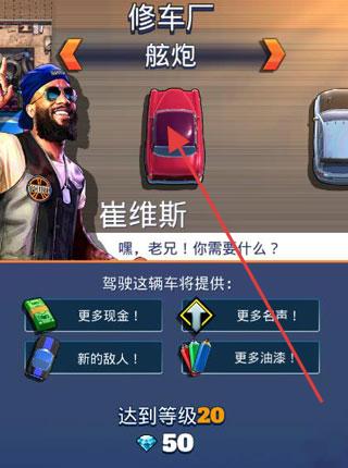 2、修车厂界面,选择“崔维斯”的红色赛车“舷炮”,驾驶可获“更多现金、新的敌人”等,达到等级20,消耗钻石解锁。