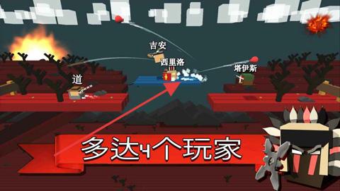 1、多人对战场景,显示“多达4个玩家”,角色有“吉安”“西里洛”等,在横版地图(如红色荒地)战斗,发射弹药,互相攻击。