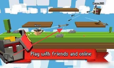 2、联机对战界面,呈现“Play with friends and online”,角色(如Nocco)在绿色草地地图,与队友/在线玩家协作,对抗敌人(如飞行单位)。