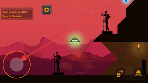 2、在红色地貌关卡,按【Scan Ancient Texts01】等任务指引,操控飞碟扫描古迹,留意场景中雕像等元素,完成探索目标。