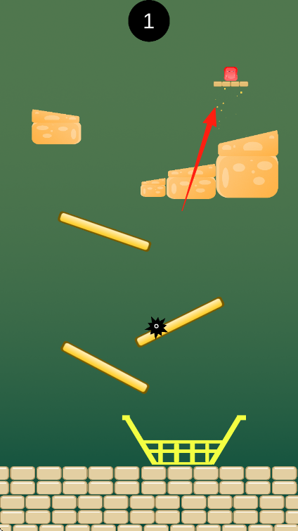 1、开局准备点击黄色播放键,进入关卡1,观察果冻(粉色方块)、障碍(黑色尖刺)、目标(黄色篮子)布局。