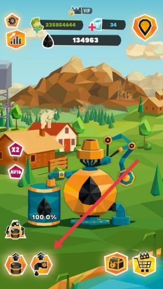 3、切换到绿色场景,点击箭头指向的升级按钮,强化设备(如油泵),提升石油开采效率与产量。