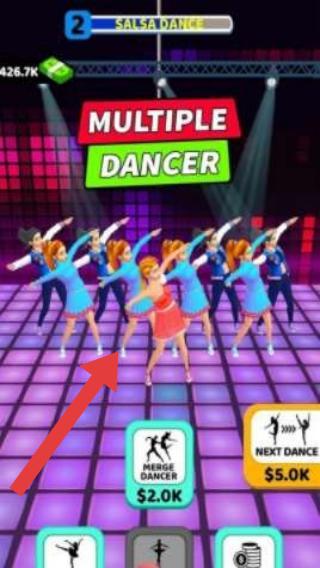 3、“MULTIPLEDANCER”提示,还有“MergeDancer”“NextDance”功能按钮,呈现舞者表演萨尔萨舞的场景,玩家可通过合并舞者、解锁新舞蹈来经营舞蹈团队。