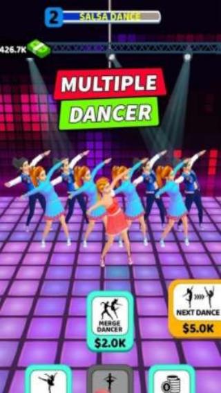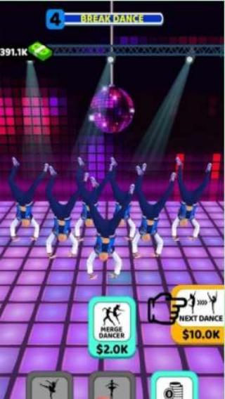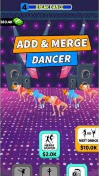 1、有“ADD&MERGEDANCER(添加并合并舞者)”玩法提示,以及“NEWDANCER”“NEXTDANCE”等功能按钮,玩家可通过添加、合并舞者来经营舞蹈团队,开展舞蹈表演。
