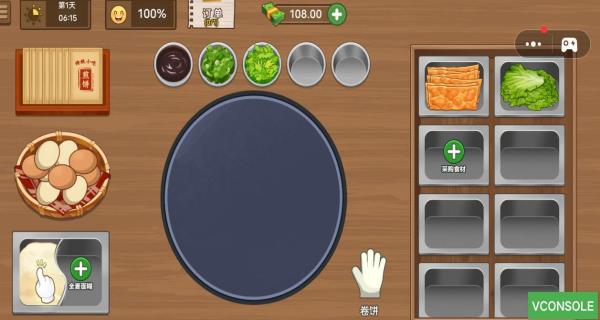 3、进入煎饼制作界面,点击左侧食材,按步骤添加至煎锅,搭配右侧生菜等食材,完成经典煎饼制作,交付订单。