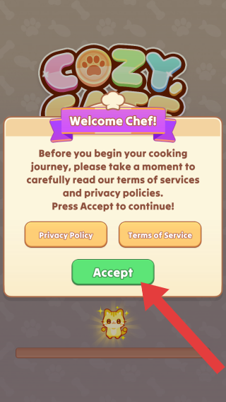 1、呈现欢迎语(WelcomeChef!)、服务条款与隐私政策提示,需点击【Accept】进入烹饪旅程,属于模拟烹饪经营类,玩家将开启烹饪相关的体验。
