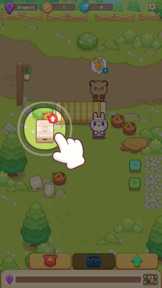 2、呈现“stage1-1”关卡,有兔子、小熊等角色,还有任务指引(手指点击带红点的界面),属于轻松的经营养成或闯关玩法,玩家可在其中体验经营、互动等内容。