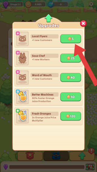 3、“Upgrades”板块,包含“LocalFlyers”、“SousChef”、“WordofMouth”、“BetterMachines“FreshOranges(新鲜橙子,橙汁价格翻倍)”等升级项,用于提升经营能力。