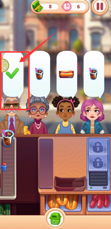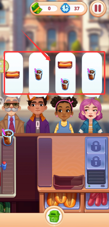 1、进入游戏后,需要快速查看客人点单需求,准确制作对应的餐点和饮料完成订单。