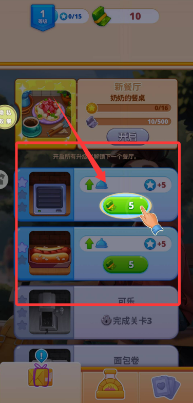 3、使用赚取的收益可以提升烹饪设备效率,解锁更多菜品种类吸引新顾客光临。