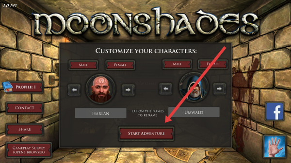 2、在角色创建页,选性别、角色(Harlan、Umwald),点【START-ADVENTURE】,进入冒险。