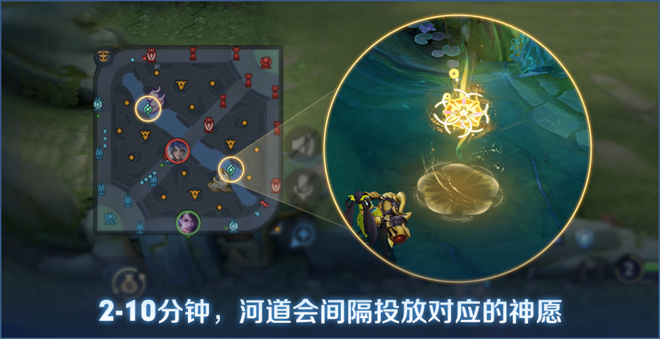1、场景与机制适配:河道场景(地图核心资源带)适配神愿投放(关键资源争夺点),场景特性(连通多路、野区衔接)服务神愿价值(控制河道辐射多线)。