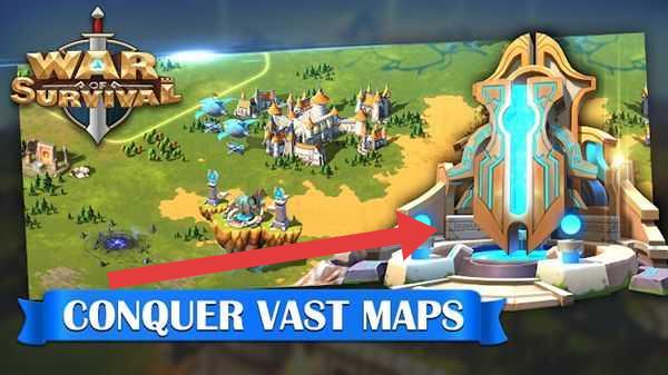 2、在地图页,跟随“CONQUER-VAST-MAPS”指引,攻打箭头指向的大型建筑,扩张领土,掠夺资源。