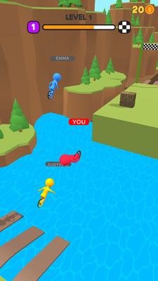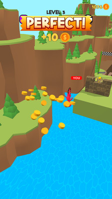 1、在赛道(如河流断桥、阶梯金币关)操控角色(YOU),滑动屏幕调整方向、避开障碍。