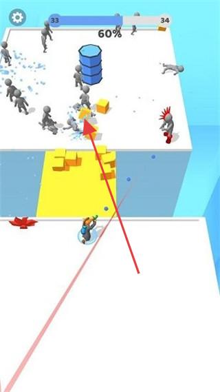 1、战斗场景,角色持武器,在立体空间(如蓝白平台)射击灰色敌人,利用场景道具(油桶),推进进度(60%),画面色彩鲜明,主打解压射击。