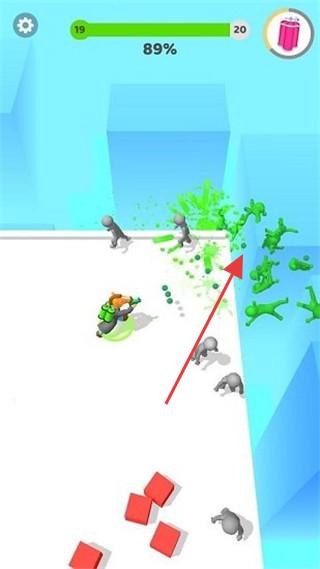 2、绿色进度(89%)关卡,角色喷射绿色液体,消灭灰色敌人,通过击碎方块、清理敌人,提升进度,延续解压战斗体验。