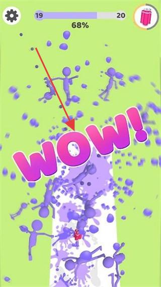3、“WOW!”特效场景,角色造成紫色爆炸效果,大量敌人被消灭,通过炫酷特效、密集敌人,强化解压爽感,完成关卡推进。