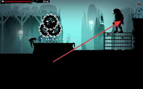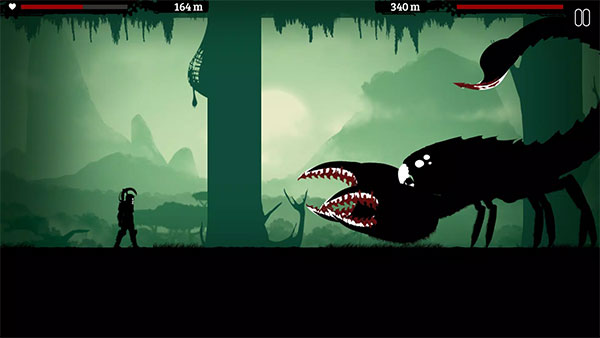 1、游戏场景为幽暗森林,有巨型怪物、人形敌人,角色在冒险,需躲避/战斗,推进距离(25m),画面呈现剪影美术,营造神秘氛围。