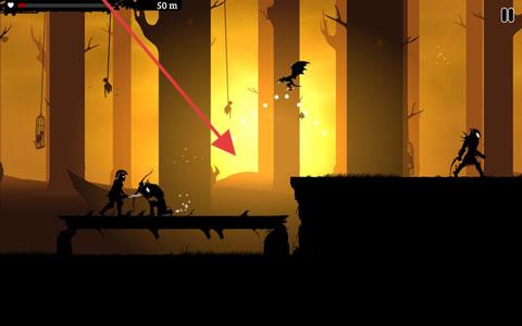 2、阳光森林场景,角色遭遇敌人(如持械者),空中有飞龙,限时(50m)闯关,利用地形(木桥)战斗,延续剪影画风。