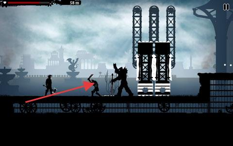 3、工业风场景,角色面对大型敌人(如巨怪),背景有工厂建筑,推进距离(58m),通过战斗、跑酷,完成冒险,展现剪影艺术下的多样关卡。