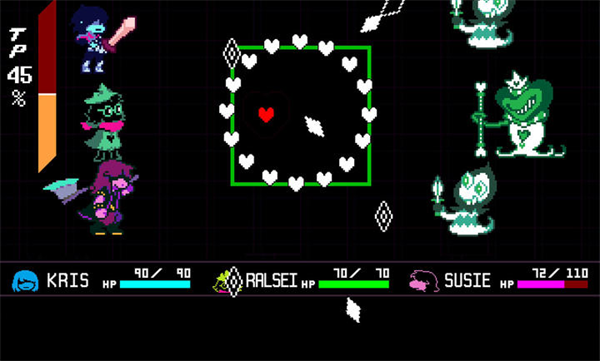 1、神经病队友:Kris的沉默寡言和Susie的暴力美学形成绝妙反差,Ralsei总在试图用爱心感化队友却常被斧头打断。