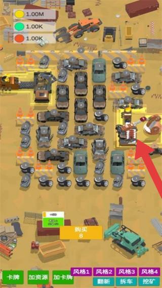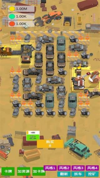 1、有黄色汽车、“风格1-4”“翻新”“拆车”“挖矿”等功能按钮,属于汽车改装、经营玩法,玩家可对车辆进行风格更换、翻新等操作,常见于休闲模拟品类。
