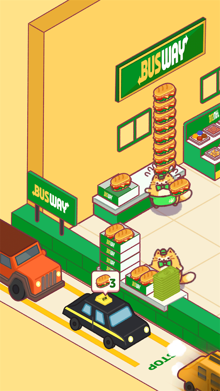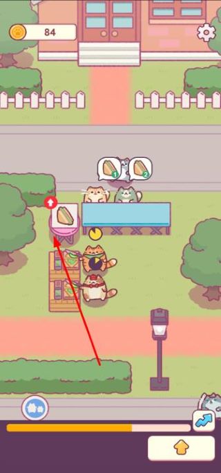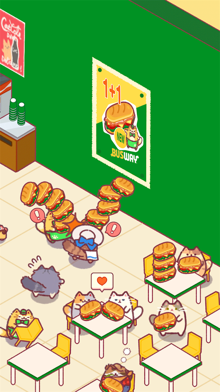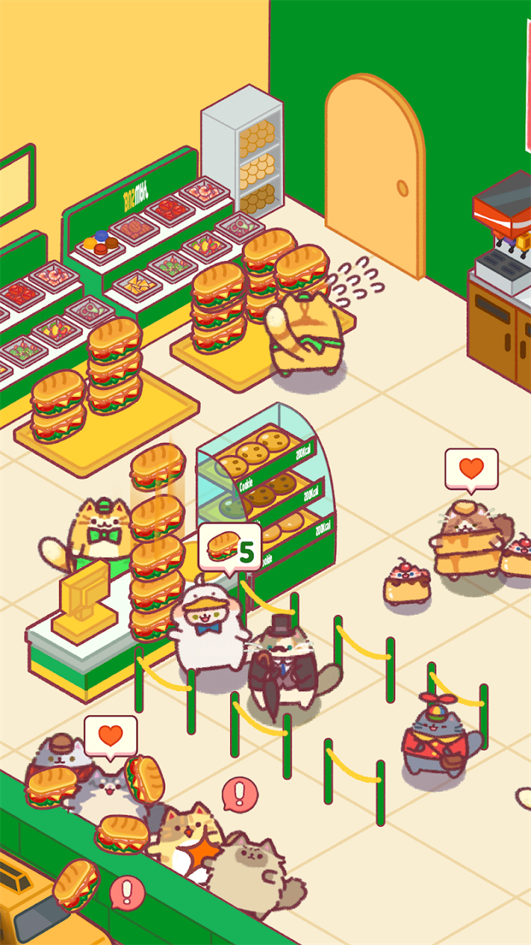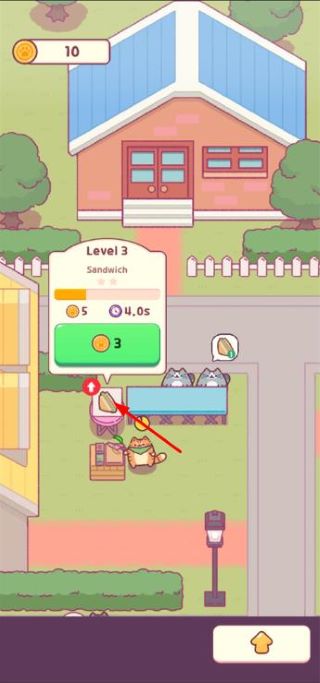 2、游戏中途,将制作好的三明治递给顾客猫,赚取金币后可升级三明治品质,或解锁新的制作机器,同时招募猫咪员工协助经营。