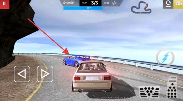 2、比赛中操控金色赛车,利用右侧加速按钮(闪电图标),在弯道与直道灵活超车,提升行驶位次,追赶前车。