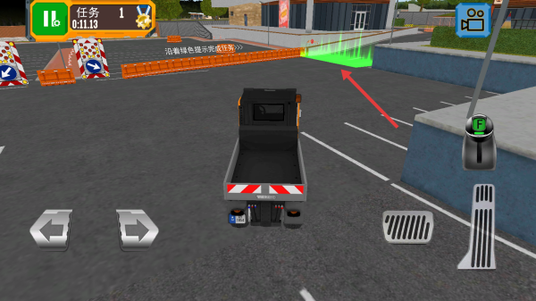 2、按绿色路线(“沿着绿色提示完成任务”),控方向,避障碍,行驶到指定区域。