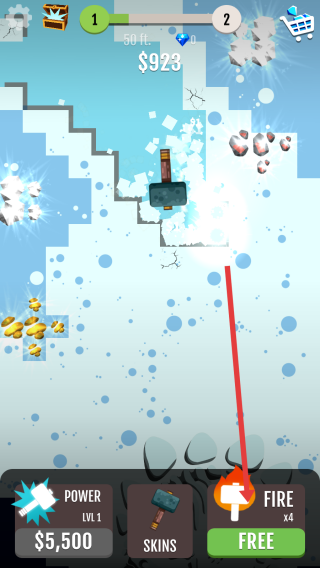 1、点击屏幕,长按控制锤子挖掘,按照“TAP&HOLD-FIND-TREASURES”指引,探索宝藏,积累金币。