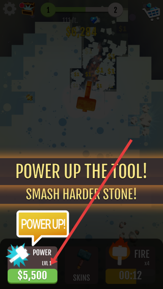 3、积累足够金币后,点击【POWER-UP!】,消耗$5,500升级工具,提升挖掘能力,挑战更坚硬矿石。