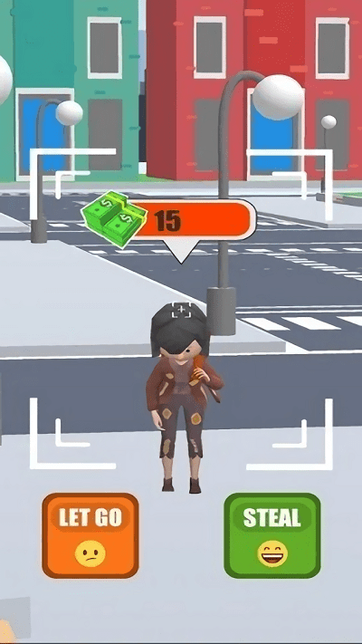 1、进入游戏后在3D城市场景中移动视角,观察路人头顶的资产标识,选择携带高价值物品的目标作为行窃对象。