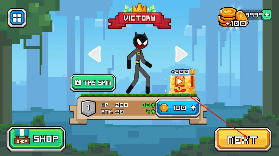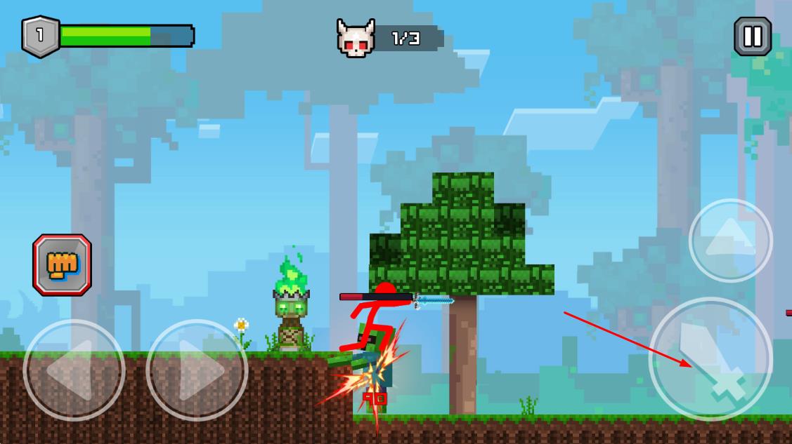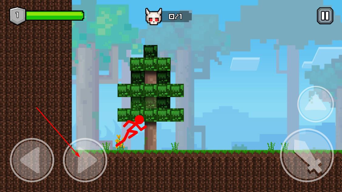 1、进入游戏后操控火柴人在复古像素世界中移动,熟悉基础攻击和技能释放,开启冒险。