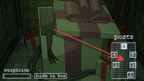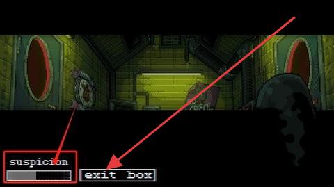 1、进入场景,关注左下角“suspicion”条,遇敌人靠近,及时点【hide in box】躲进箱子,降低被发现风险。