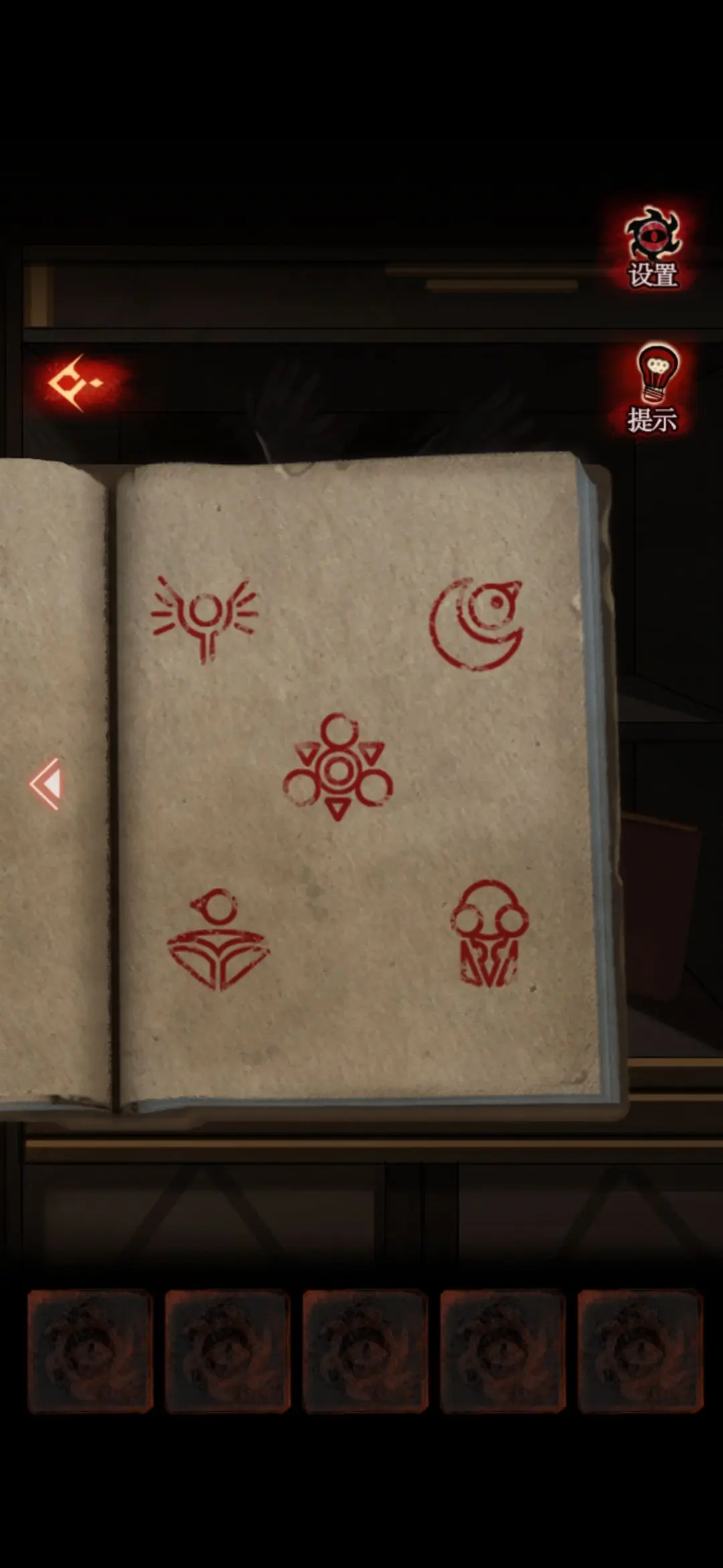 神像处解谜:点击书本获得提示,点击神像处根据提示按图中位置摆放,将硬币放入投币机得到瓶子,注意投币机外面符号代表数字1,建立符号与数字的转换关系。